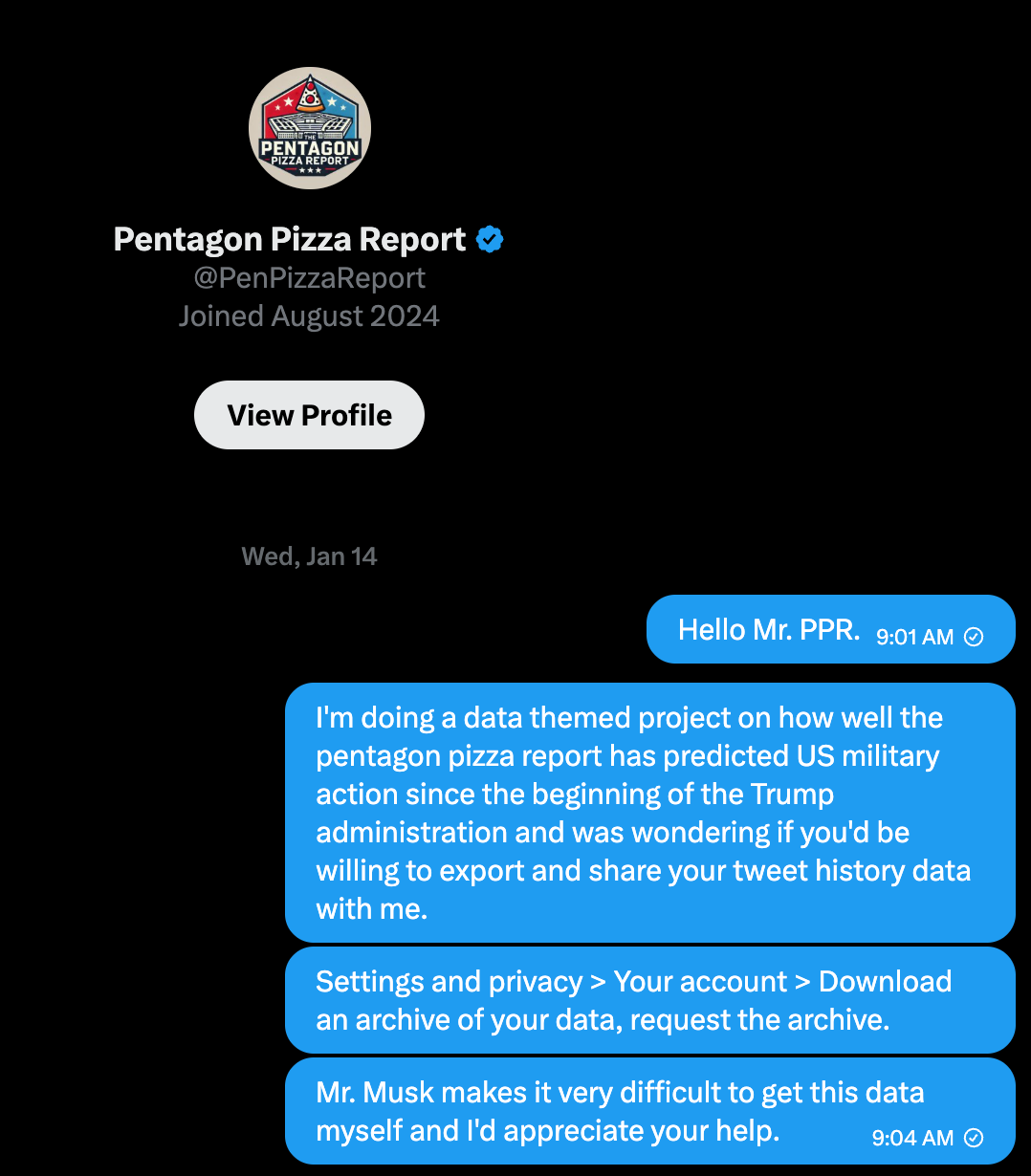 The Twitter API used to be a cornucopia for interesting data projects. Now you have to pay a fortune for API access and it’s legitimately terrible. I actually could not get anything to work using the API or even using standard scraping tech to get the Pentagon Pizza Report’s tweet history; Musk has shut a lot of that shit down. I couldn’t even get ChatGPT, run by Musk’s rival Sam Altman, to help me improve the scraping against Twitter because it thought that was unethical. I even DM’ed the Pentagon Pizza account to see if he would share his data, but he did not get back to me.